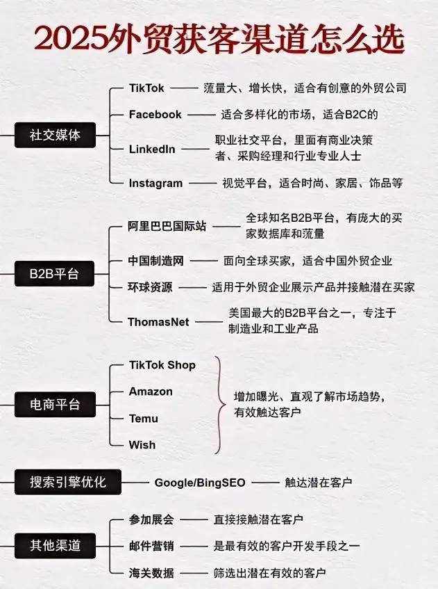 社交媒体 TikTok—— 流量大、增长快,适合有创意的外贸公司 Facebook—— 适合多样化的市场,适合 B2C 的 LinkedIn—— 职业社交平台,里面有商业决策者、采购经理和行业专业人士 Instagram—— 视觉平台,适合时尚、家居、饰品等 B2B 平台 阿里巴巴国际站 —— 全球知名 B2B 平台,有庞大的买家数据库和流量 中国制造网 —— 面向全球买家,适合中国外贸企业 环球资源 —— 适用于外贸企业展示产品并接触潜在买家 ThomasNet—— 美国最大的 B2B 平台之一,专注于制造业和工业产品 电商平台 TikTok Shop Amazon Temu Wish (增加曝光、直观了解市场趋势,有效触达客户) 搜索引擎优化 Google/BingSEO—— 触达潜在客户 #FB运营 #跨境电商 #品牌出海 #外贸经验 #社媒营销 #外贸知识 #ins运营 #海外获客怎么做 #海外获客品牌出海